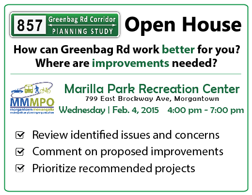 From: Jing Zhang jingzhangaicp@gmail.com Subject: Greenbag Rd Corridor Planning Open House Date: January 26, 2015 9:13:53 AM EST To: The Morgantown Monongalia MPO is to hold a public open house for Greenbag Rd Corridor Planning Study. The location is at the Marilla Park Creation Center; the time is on February 4th, Wednesday, from 4:00 PM to 7:00 PM.