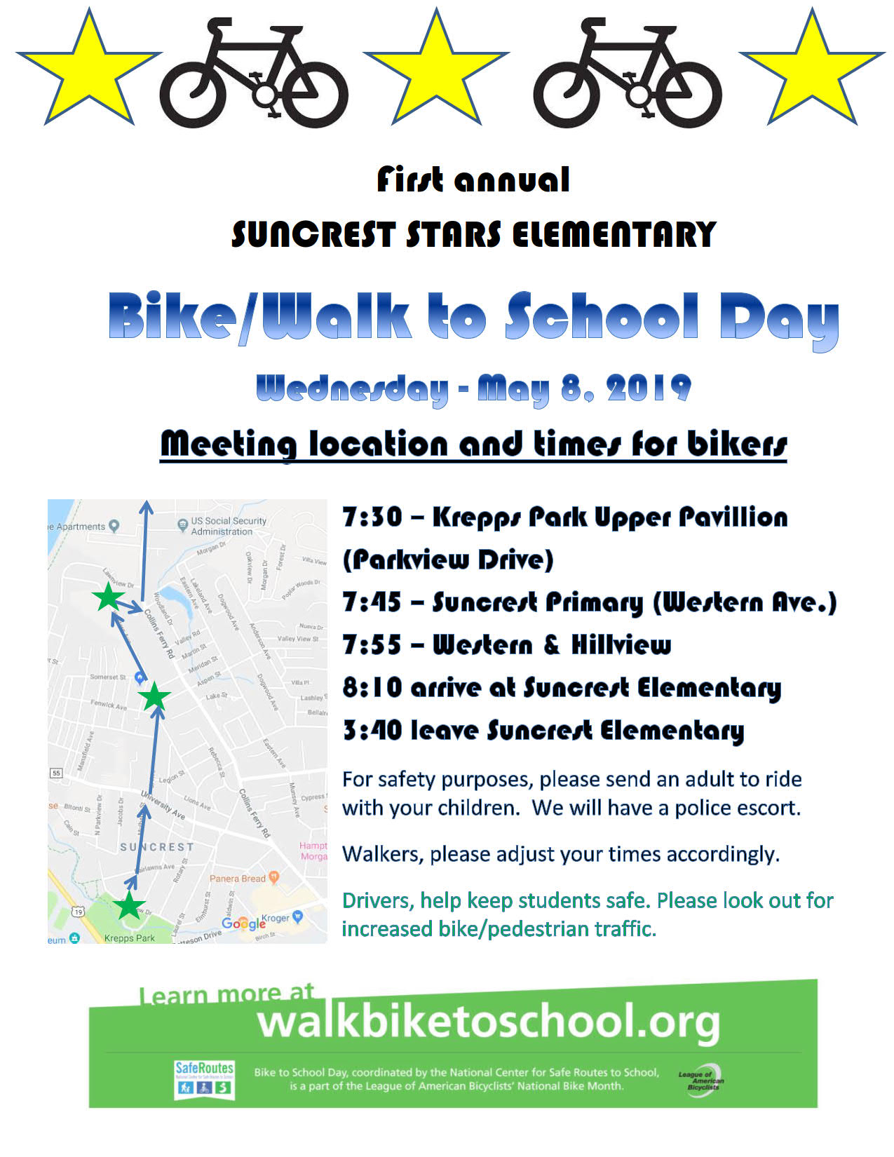 Here's the Suncrest ES flyer. On Thursday, May 2, 2019, 10:38:01 AM EDT, Christiaan Abildso via Bikeboard bikeboard@bikemorgantown.com wrote: I'm pretty limited next week, but wanted to share that we will likely have 4 schools riding on Wed May 8th - Bike to School Day.South MS & Suncrest MS, likely depart 6:45 or so (South from MHS; Suncrest unsure); Suncrest ES & Mountainview ES depart 7:45 (Suncrest from Krepps area; M'view from my house). Attached is the flyer for Mountainview. We have MPD helping the ES rides, I'll probably hang the big banners at ESs the night prior.Always happy for help riding and/or with info dissemination! Christiaan On Thursday, May 2, 2019, 2:13:10 AM EDT, Jonathan Rosenbaum via Bikeboard bikeboard@bikemorgantown.com wrote: One of the really exciting Morgantown bike stories to celebrate this May would be Positive Spin's epic move over this Winter with a small band of intrepid volunteer into our new, amazing location at 1216 University Avenue.