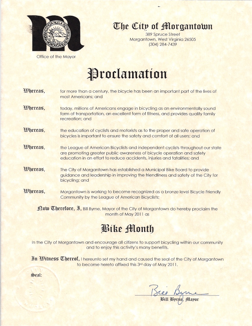 For at least the past 3 years, the Bicycle Board has arranged for the Mayor to proclaim May as Bike Month in Morgantown. Attached is last year's proclamation. Since we are not meeting this month, are we going to drop the proclamation? If not, I think this is an opportunity to have the Mayor publicize the things that we are going to do for bike month. I thinking we could add them to the Whereas clauses. *PLEASE ADVISE. * e.g. what are we actually doing for bike month?