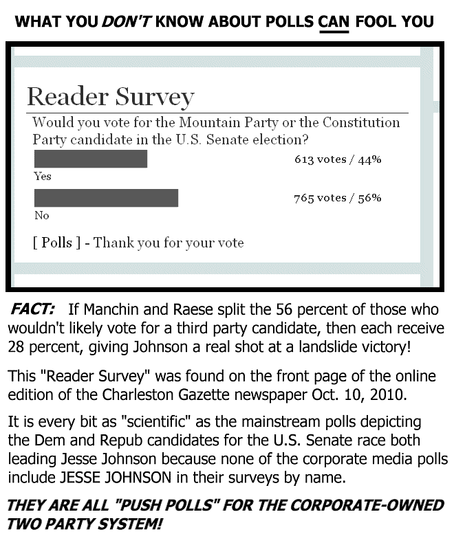 On the lefthand side scroll down to the survey question and vote for 3rd party representation in WV. Ken Hechler and Larry Gibson have called this to my attention and we need some votes in favor of 3rd parties.