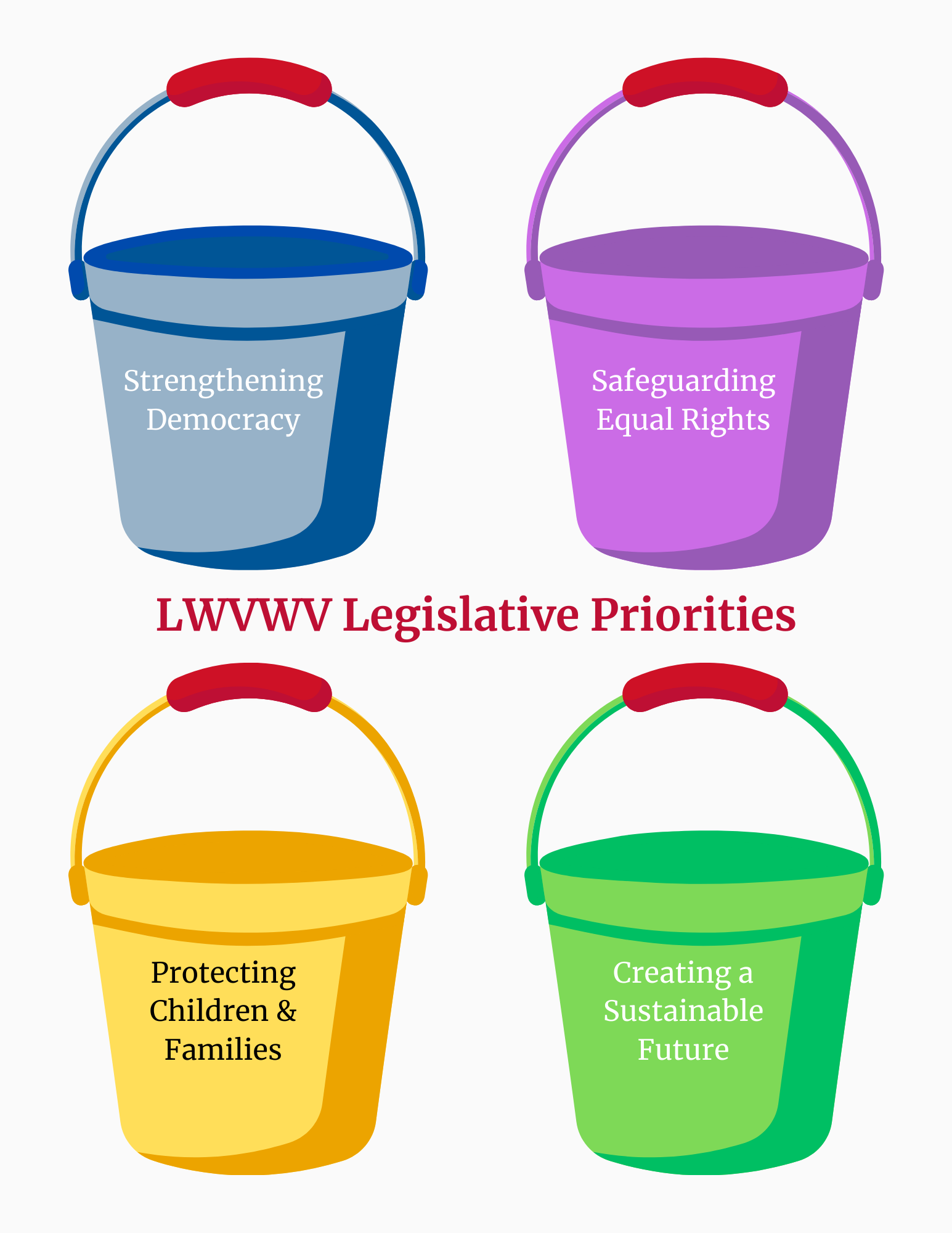 Jonathan Rosenbaum is providing technical support. Lyn Widmyer will manage Make Some Noise notices to members when we need your help to contact legislators. Julie Archer serves a our lobbyist on the ground in Charleston. [image: LWVWV 4 Buckets.png]