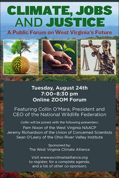 The West Virginia Climate Alliance and a number of other organizations are holding a virtual public forum on Tuesday, August 24th from 7 to 8:30 pm. Climate, Jobs and Justice: A public forum on West Virginia's future is designed to educate and inform the public where climate policy stands in Congress and what people can do to impact this policy. Collin O'Mara, President and CEO of the National Wildlife Federation, will be joined by Pam Nixon of West Virginia NAACP, Jeremy Richardson of Unions of Concerned Scientist, and Sean O'Leary of Ohio River Valley Institute. It's a great lineup.