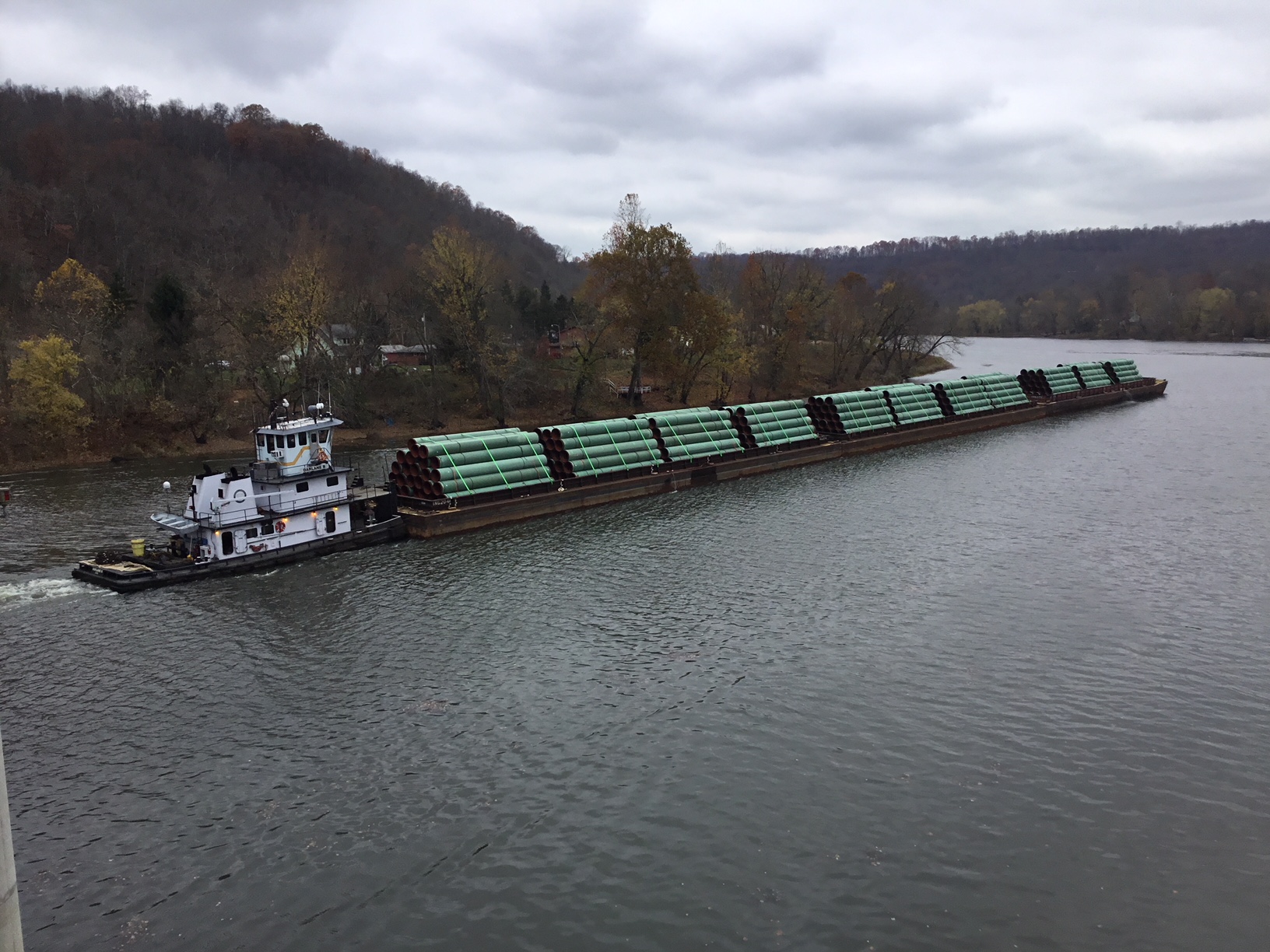 River barges with 42 inch pipe passing the mouth of the Cheat River @ 9 AM on 11/12/20 headed toward Pittsburgh, PA